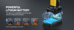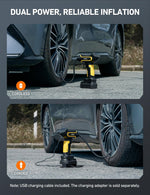 【Battery & DC Power Supply】: This tire inflator uses dual power supplies, making it easy to switch between cord and cordless inflation modes. Inflation is much more convenient with both 20 V lithium battery power and DC 12 V power options. This tire inflator makes an ideal troubleshooter on every trip. You’ll never need to worry about running out of power on the go. 🧡NOTE: (Output: 5V/2A)Charger not included!
